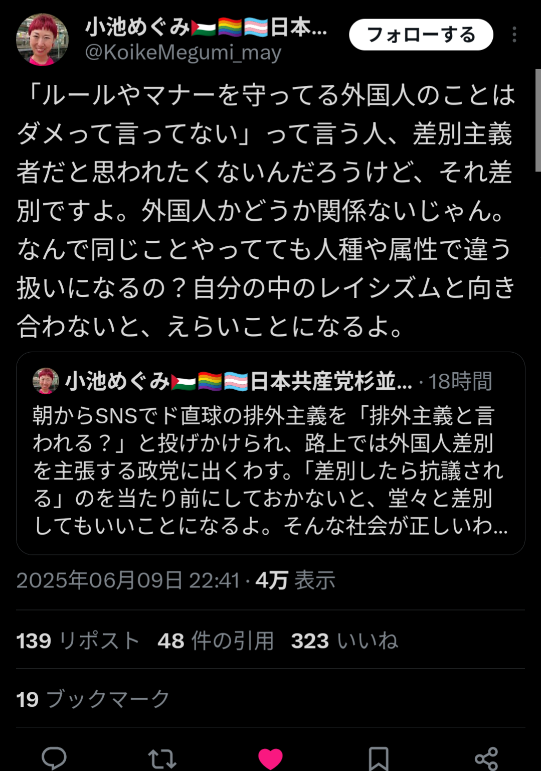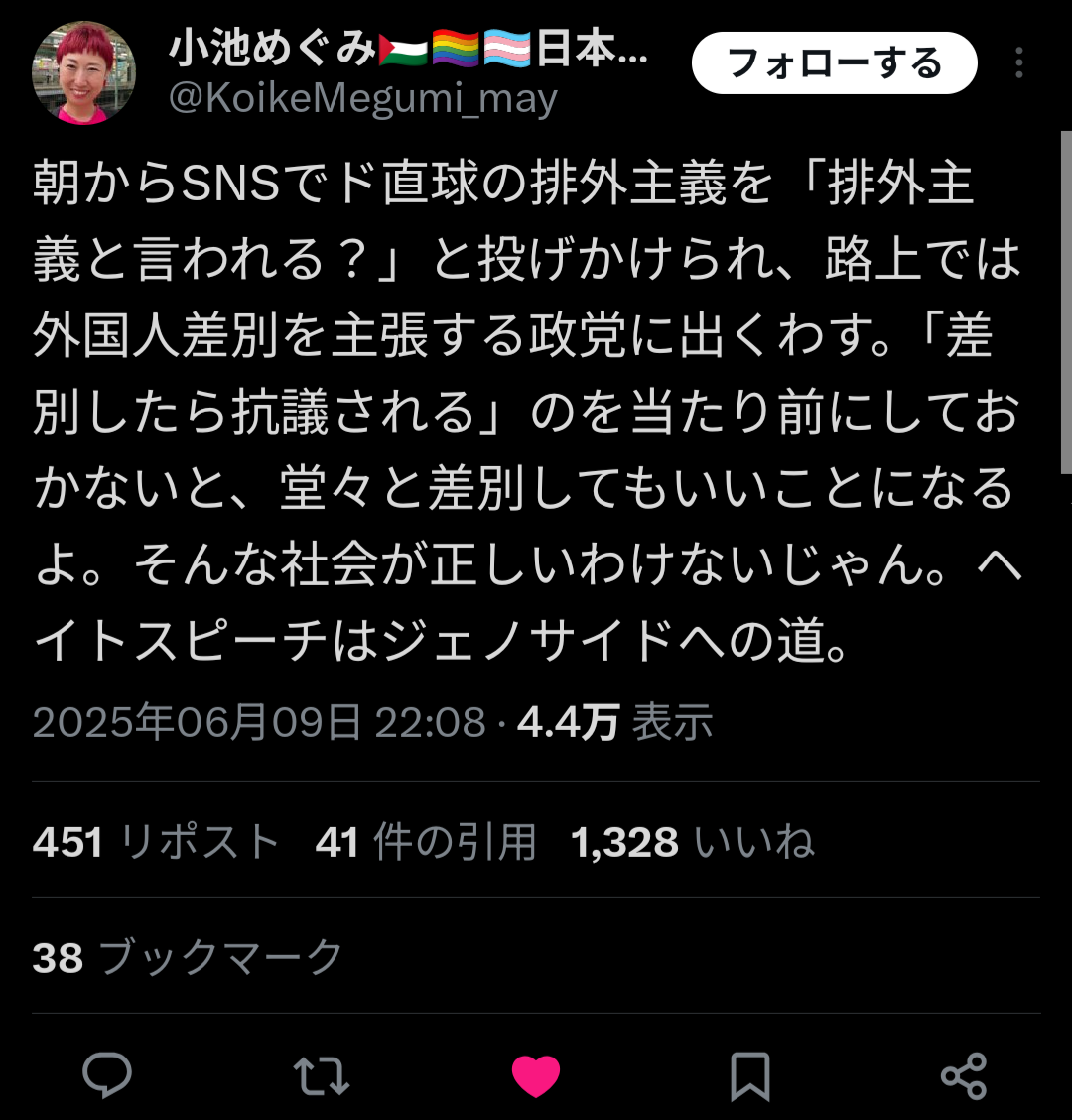朝からSNSでド直球の排外主義を「排外主義と言われる?」と投げかけられ、路上では外国人差別を主張する政党に出くわす。「差別したら抗議される」のを当たり前にしておかないと、堂々と差別してもいいことになるよ。そんな社会が正しいわけないじゃん。ヘイトスピーチはジェノサイドへの道。