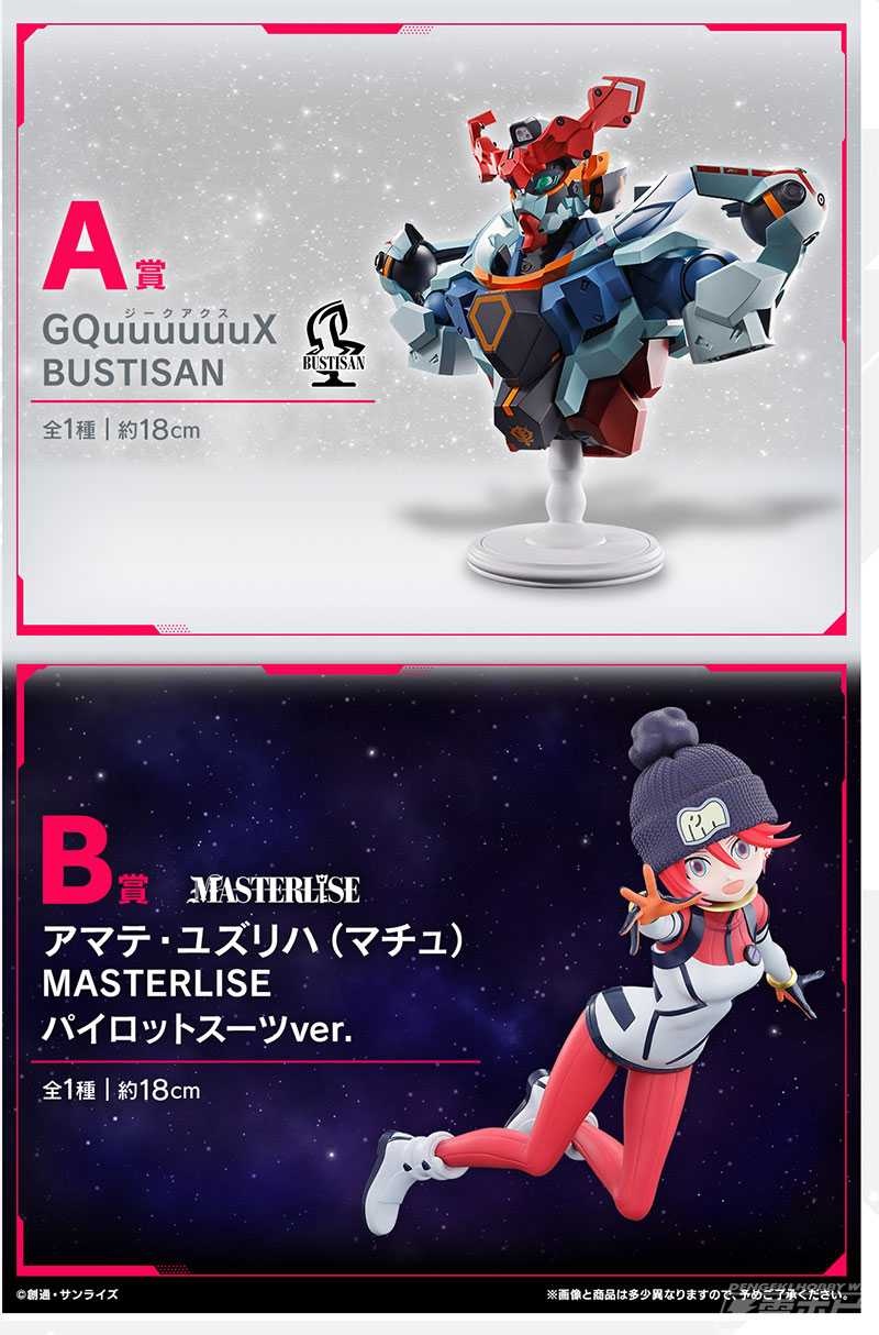 A賞には、新胸像フィギュアシリーズ「BUSTISAN」よりGQuuuuuuXが登場。B賞は、「MASTERLISE」シリーズのアマテ・ユズリハ(マチュ)パイロットスーツver.です。そしてラストワン賞には、GQuuuuuuX(エンディミオン・ユニット覚醒時)が「BUSTISAN」より登場! 続報をお楽しみに!