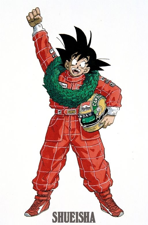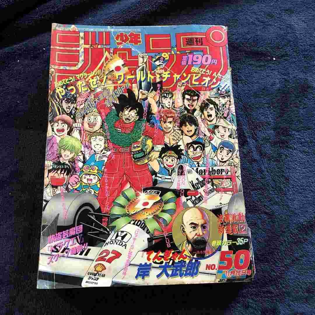 1990年11月10日発売この年、週刊少年ジャンプがスポンサーになったチームがF1のワールドチャンピオンに輝いた。その記念として表紙にジャンプヒーローが大集合し、中央には優勝トロフィーを掲げた悟空が登場! 実際の表紙では足元がF1のマシンで隠れていたが、原画では全身の姿を見ることができる。