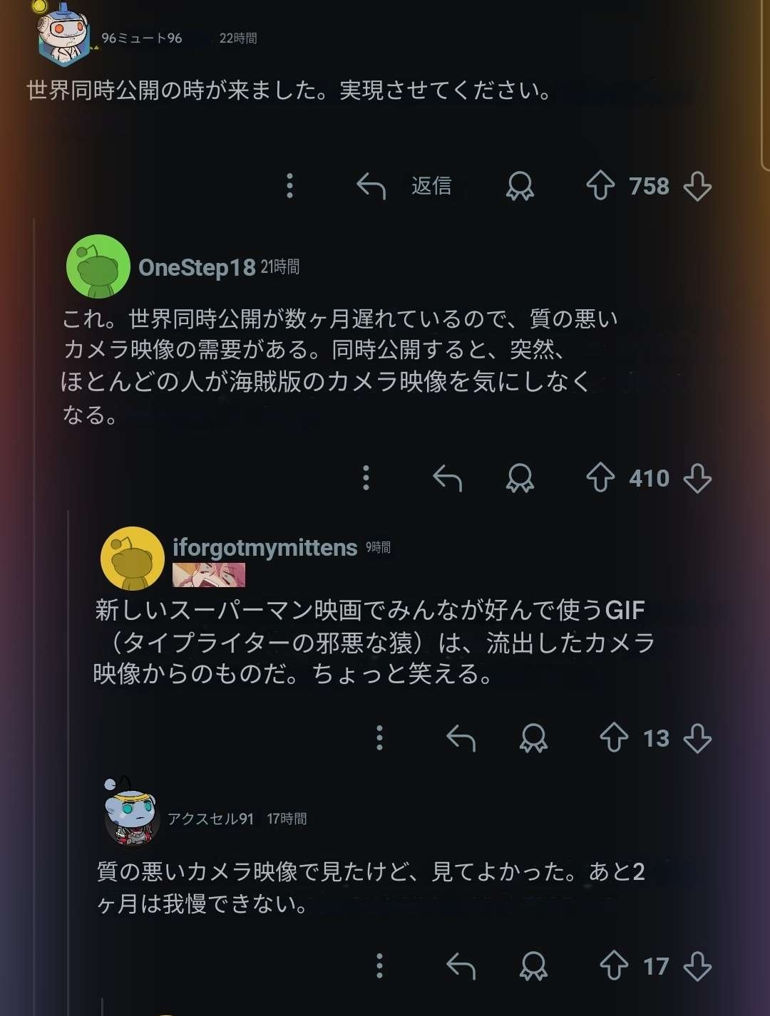 ●日本の企業もそろそろ、海賊版は完全には排除できないって理解するべきだよ。やる人はどうせやるんだから。本当に大事なのは、作品を本当に良いものにして、簡単にアクセスできるようにすること。ちゃんと作られた映画なら、盗撮映像が出回ってても普通に成功する。海賊版や低画質リークに文句を言っても意味がない。むしろ宣伝効果になることすらある。結局、品質とアクセスのしやすさが一番重要なんだよ。
