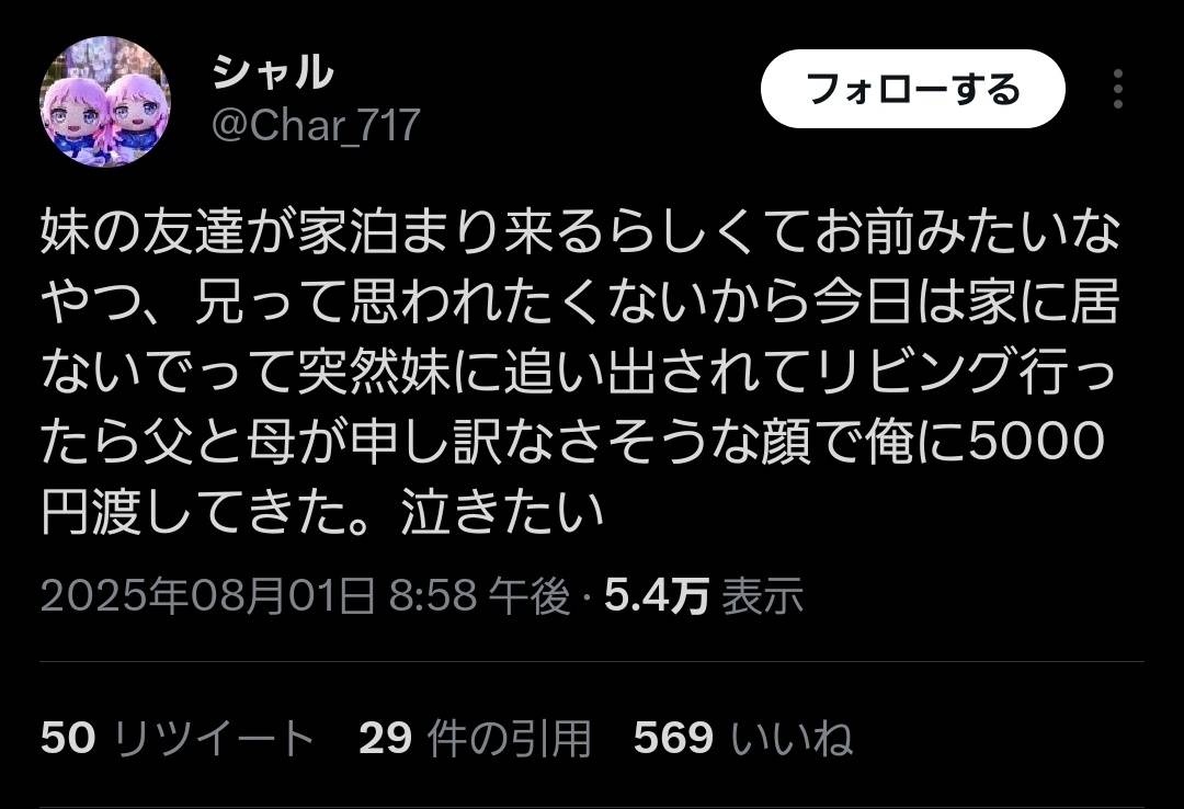 アニメオタク「妹に『友だちが来るから家出てけ』と言われ、両親から5000円掴まされました😭」