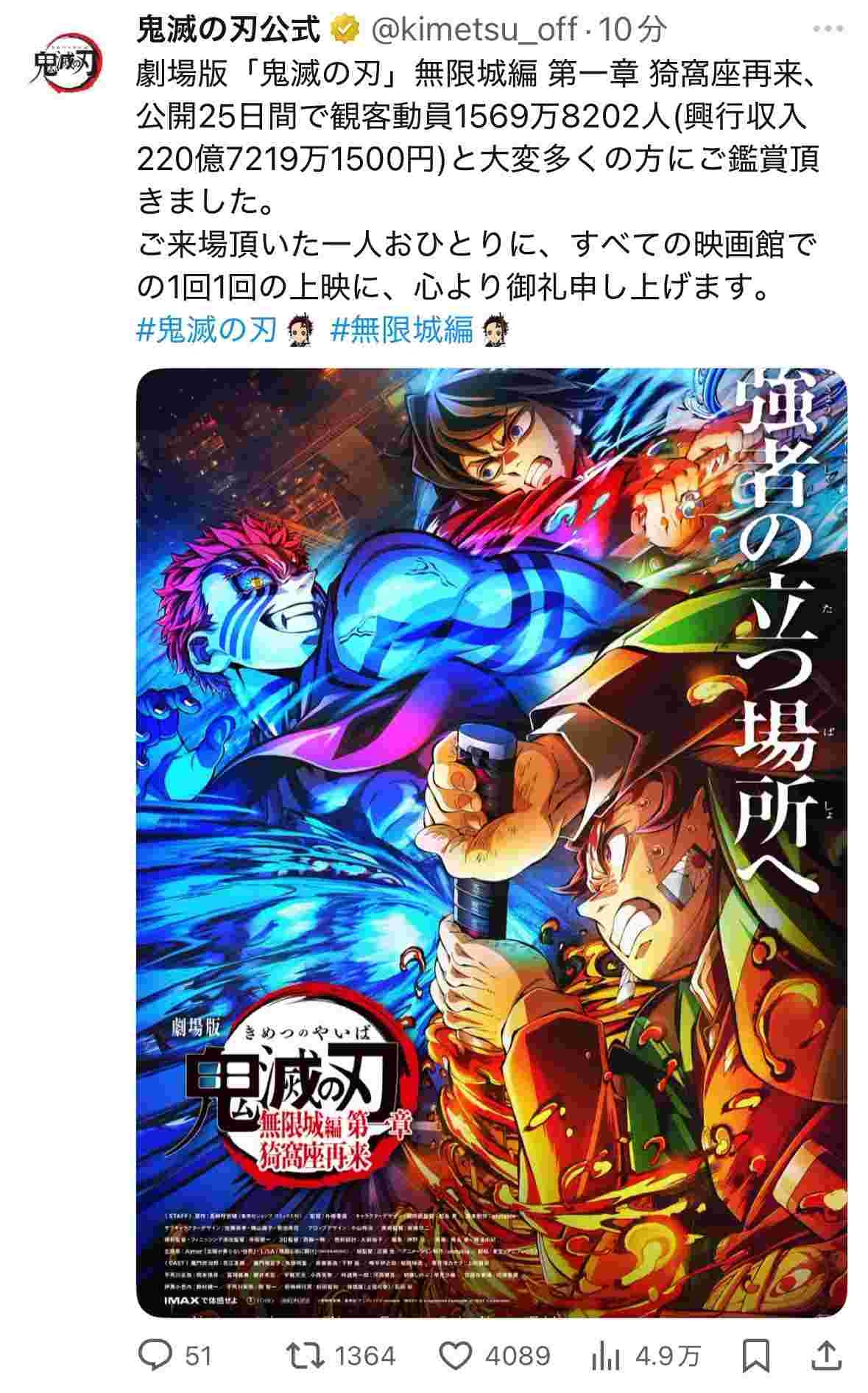 劇場版「鬼滅の刃」無限城編 第一章 猗窩座再来、公開25日間で観客動員1569万8202人(興行収入220億7219万1500円)と大変多くの方にご鑑賞頂きました。