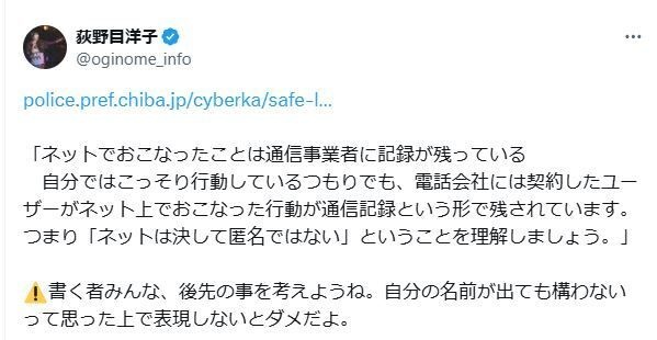 有名女性歌手「ネットは決して匿名ではない」リテラシーに持論「みんな、後先の事を考えようね」