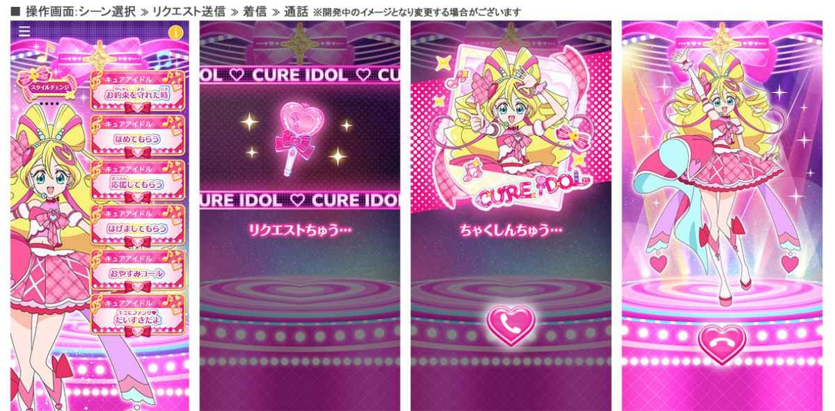 本アプリは「おはようも、おやすみも、応援してほしい時も!いつだってプリキュアといっしょ」がコンセプト。プリキュアから電話がかかってきて、励まされたり、ほめてもらえたり、応援してもらえる、まるで本当にプリキュアと電話をしているかのように楽しめる仮想電話アプリだ。