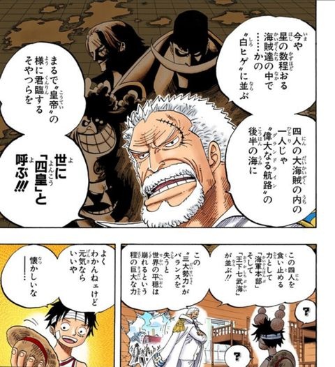四皇同士も戦ってるからどこかが暴れた時に海軍&七武海で止めるって感じなんやろうけど、まるで四皇vs海軍&七武海みたいに書いてるからおかしいんだよな
