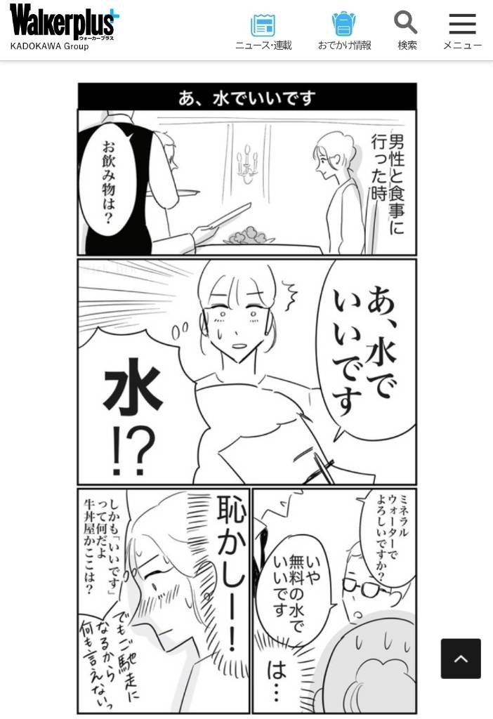 のなかには、誰も教えてくれないが知っておくべき暗黙のマナーがある。レストランでは、アルコールを飲まなくても、ミネラルウォーターやソフトドリンクなどを1つ注文するのが常識とされている。今回は、ゐさん(@irk_hrk)の創作漫画「水でいいです」を紹介する。ゐさんは、noteやダ・ヴィンチWebで漫画を連載しているほか、ホストに貢ぐ「ホス狂」を描いた『ブチヲと麗奈』も執筆している。