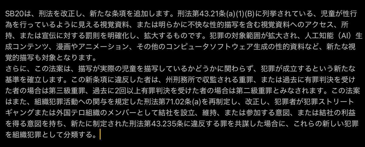 写真はTexasPublicPolicyFoundationによる要約和訳ですが、「児童のように見える」猥褻な創作物の所持等を禁じ、違反した場合Felony(1年以上の懲役または禁錮が科される可能性がある重罪)として処罰されます。