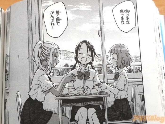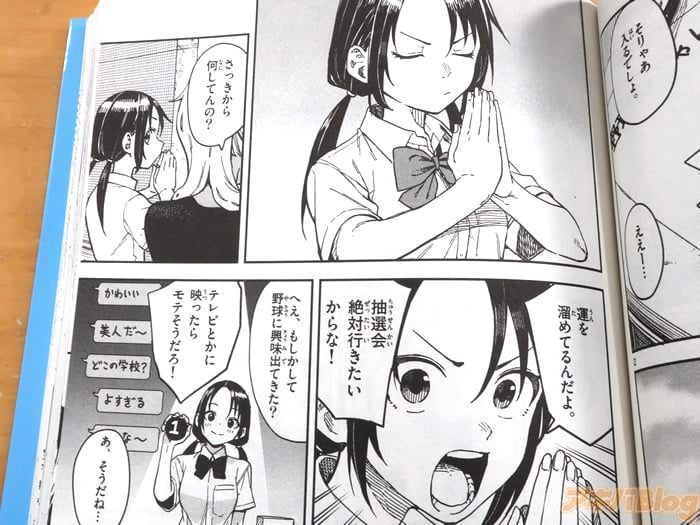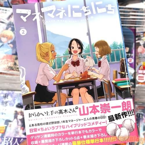 今回発売になったコミックス「マネマネにちにち」2巻【AA】には第20話から第37話と描き下ろしおまけ漫画「タイブレーク」を収録(もくじ)し、裏表紙は『どこにでもあるようでここにしかない青春のにちにち!』で、メインキャラクター3人の紹介もあり、オビ謳い文句は『日常×ちょいラブ?なハイブリッドコメディー!』、『とある高校の硬式野球部。1年生マネージャー三人の青春の日日!』などだった。