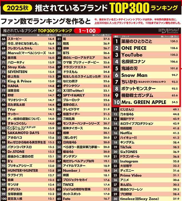 2025年最新オタクコンテンツランキングが発表される!!1位「薬屋のひとりごと」2位「ワンピース」5位「鬼滅の刃」