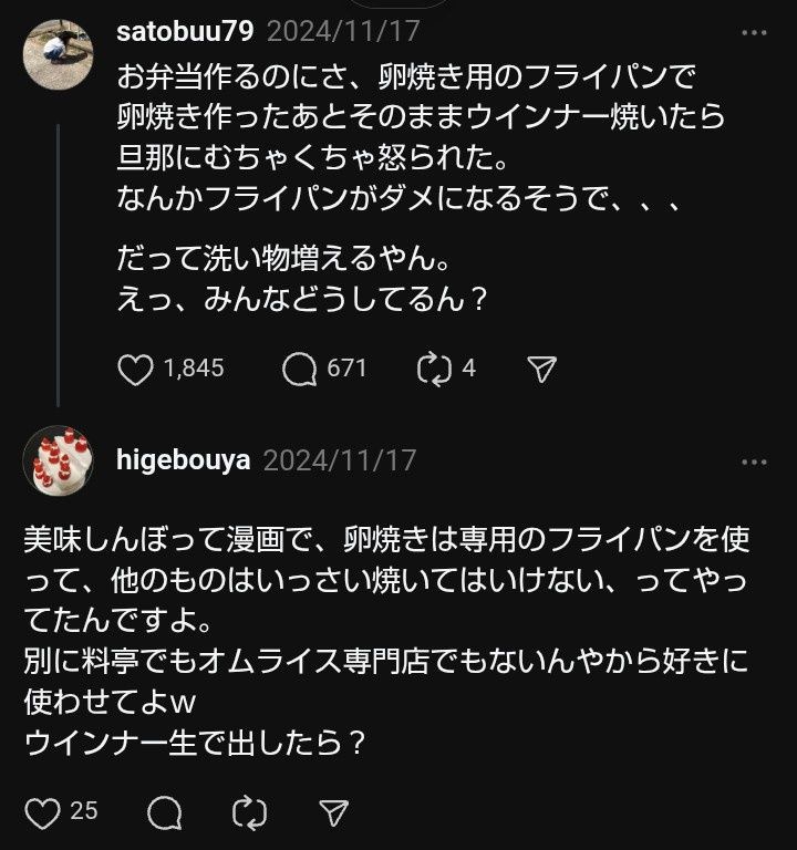 賛否両論の笠原さんは、玉子焼き作る専用フライパンは洗わないで油塗るだけって言ってた