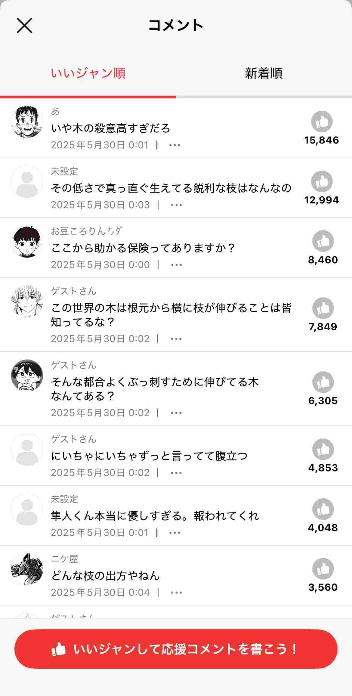 ジャンププラスのホラー漫画、意味不明な伸び方をした枝に突き刺さって死ぬwww