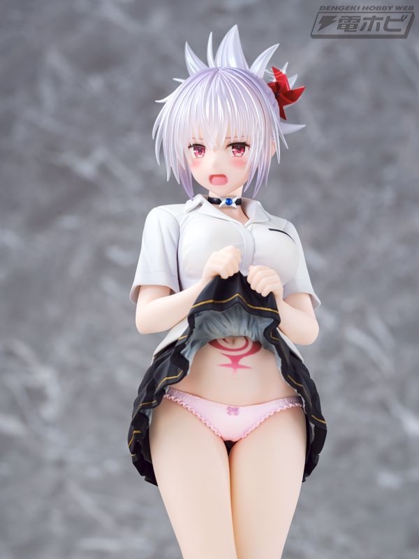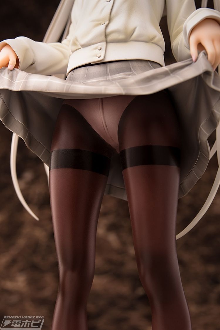 穹がスカートをたくし上げているイラストをモチーフに立体化された本アイテム。ポージングもさることながら、繊細な頭髪の流れやストッキングとその下の質感にこだわった塗装など、見どころ満載! 制服やスカートのシワもリアルに表現されていますね。