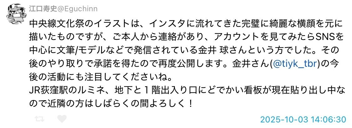漫画家・イラストレーターの江口寿史氏が、10月18日・19日にルミネ荻窪で開催される「中央線文化祭」の屋外広告イラストを手がけた。ところが、その作品が一般ユーザーの写真”無断商用利用”して”トレース”したものだったと指摘され、物議を醸している。