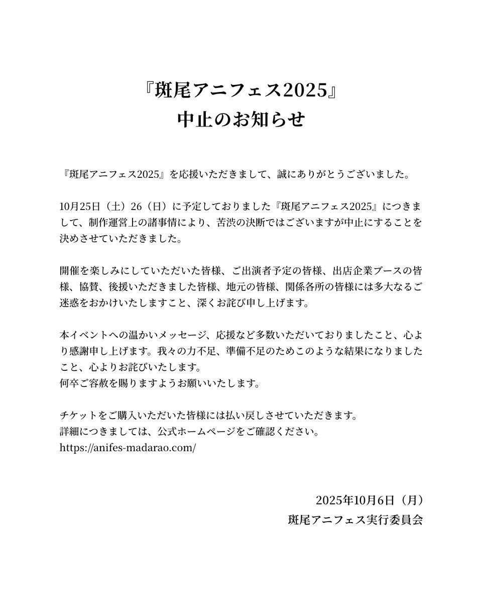 実行委は「10月25日(土)26(日)に予定しておりました『斑尾アニフェス2025』につきまして、制作運営上の諸事情により、苦渋の決断ではございますが中止にすることを決めさせていただきました」「我々の力不足、準備不足のためこの様な結果になりましたこと、心よりお詫びいたします」と報告。開催を心待ちにしていたファンをはじめ、出演予定者、出店企業、協賛・後援者、地元関係者へ謝罪した。