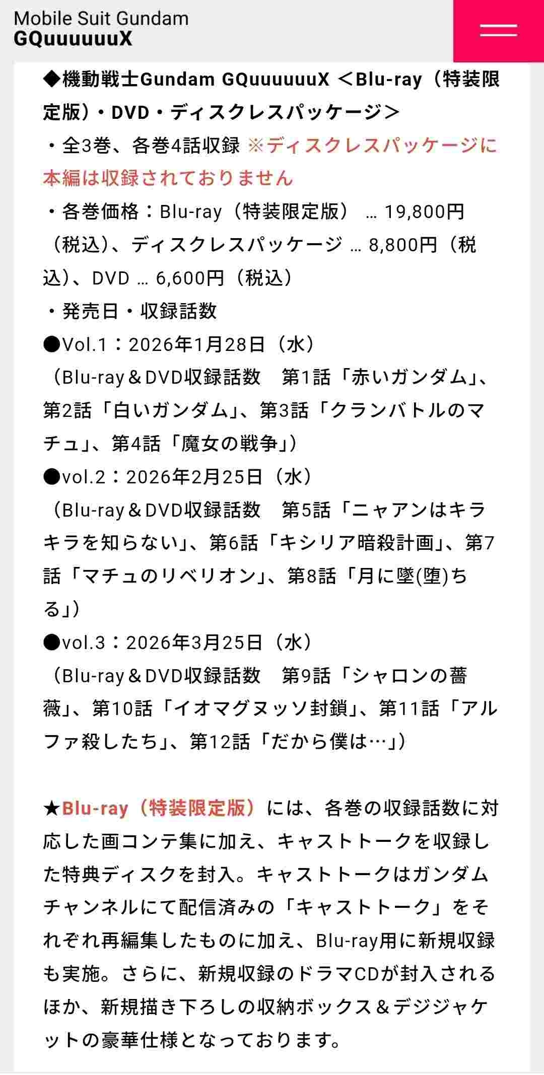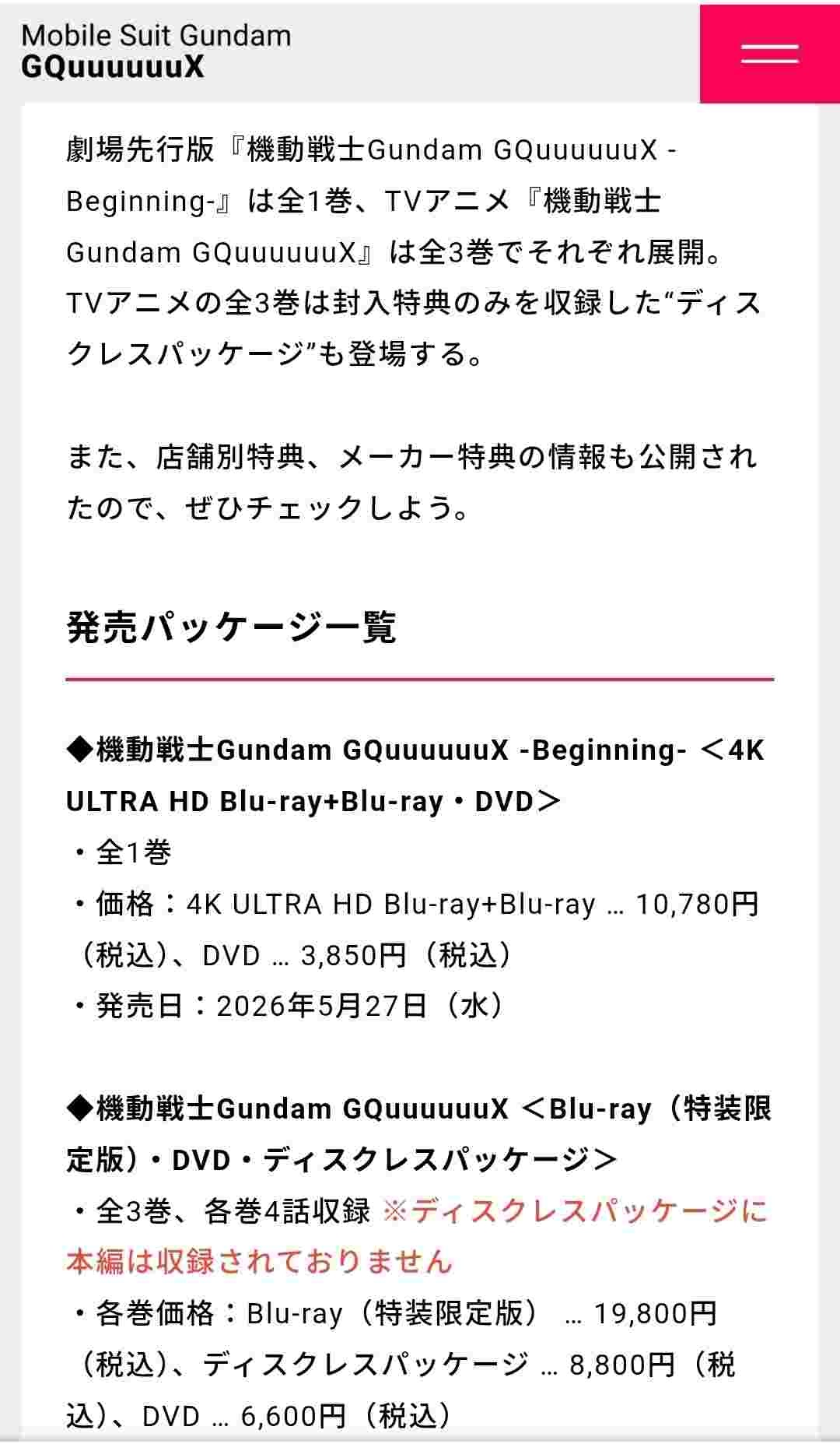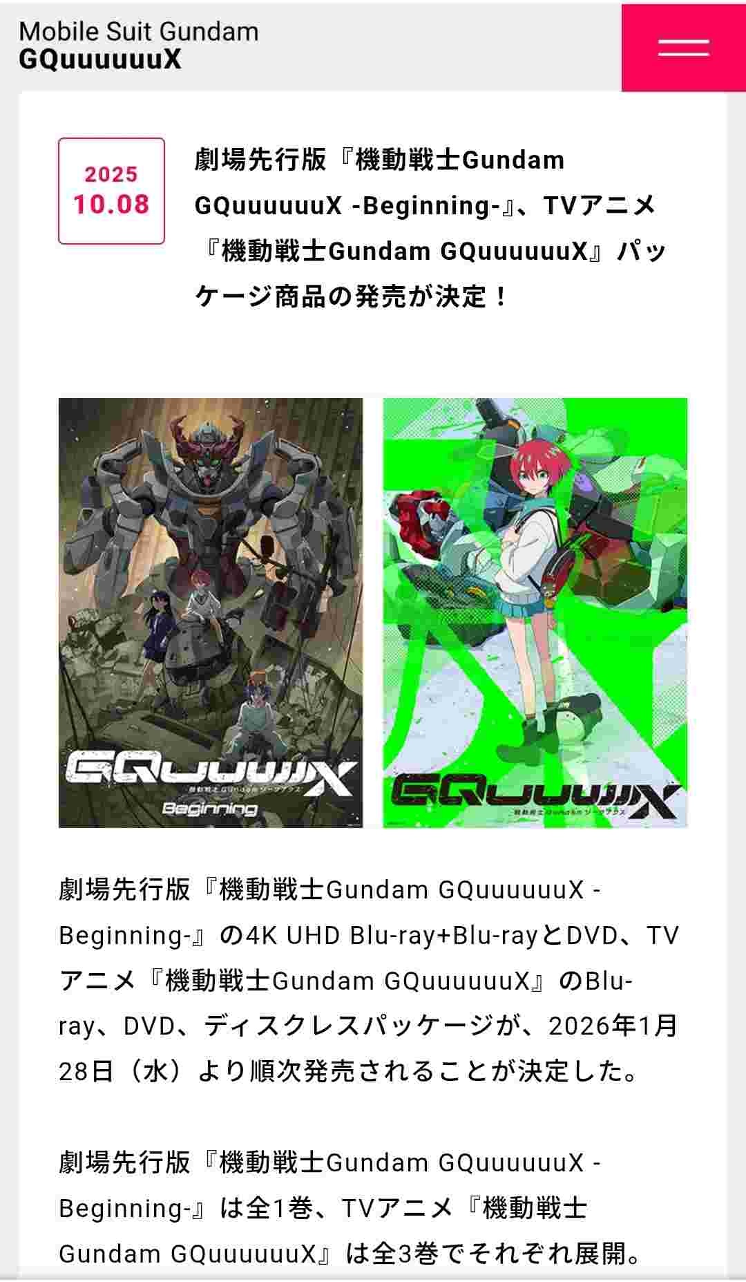 劇場先行版『機動戦士Gundam GQuuuuuuX -Beginning-』、TVアニメ『機動戦士Gundam GQuuuuuuX』パッケージ商品の発売が決定! | NEWS | 機動戦士Gundam GQuuuuuuX(ジークアクス) 公式サイト