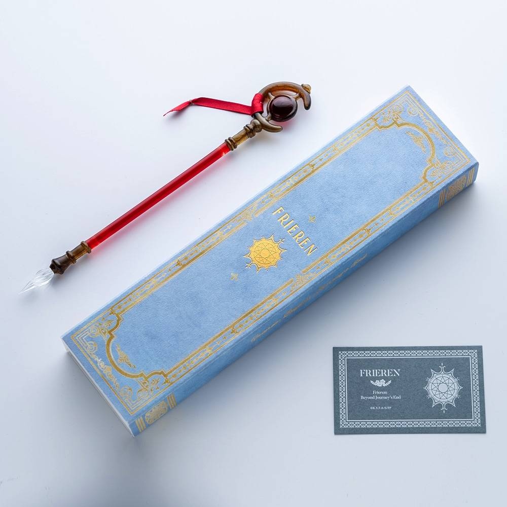 ガラスペンはフリーレンの杖、ヒンメルの剣を色はもちろん装飾品まで、職人の手作りで再現。杖は柄の末端、剣は剣先にインクを浸けて使用できる。長さは杖が約23cm、剣が約16cm。ペン1本に加えて、特製カード1枚が付属する。商品はオリジナルのパッケージでお届け。「魔導書」をイメージしたパッケージには、フリーレンとヒンメルの名前が金の箔押しで刻まれている。