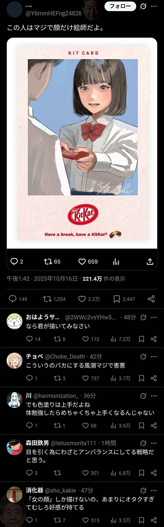ほぼ同じ角度の顔だけずっと書き続けてそれだけ上手いってあるあるだな