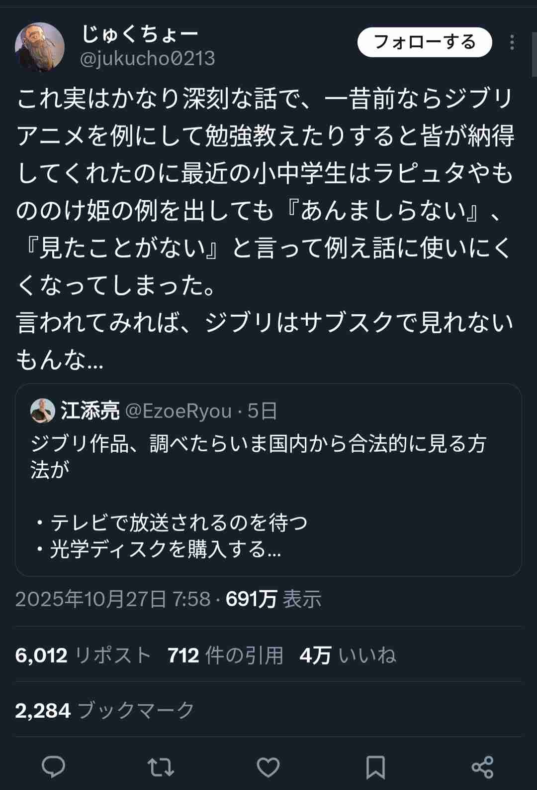 職場の若い子、いうほど若くもない30歳くらいのやつもジブリみんなが見てるの前提で話さないでくださいとか言ってるからな