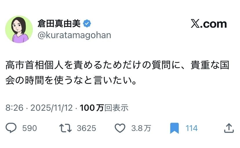 倉田真由美「高市首相個人を責めるためだけの質問に、貴重な国会の時間を使うなと言いたい。」→4万いいね
