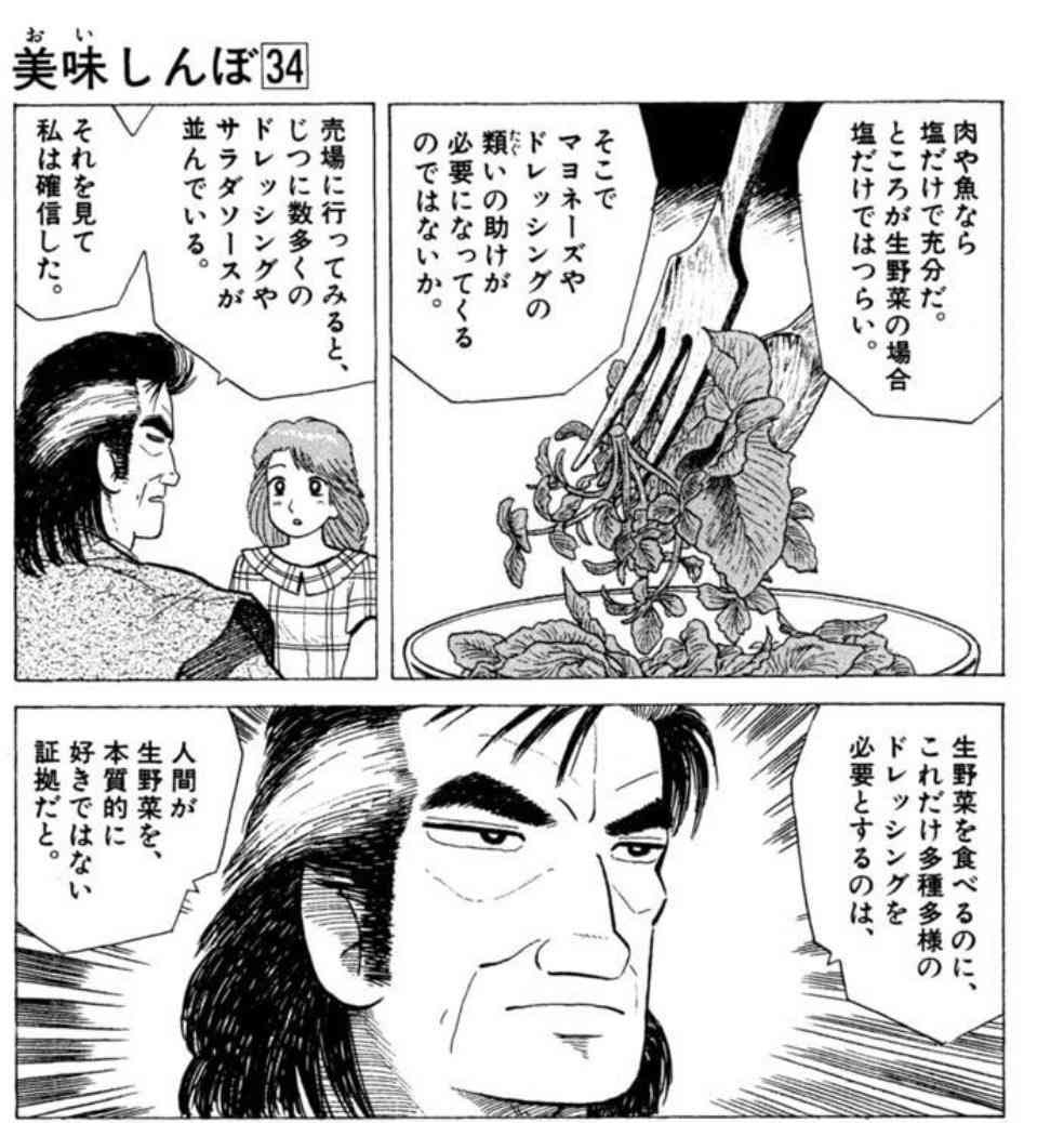 海原雄山「野菜を食べるのにドレッシングを必要とするのは、人間が生野菜を本質的に好きではない証拠」