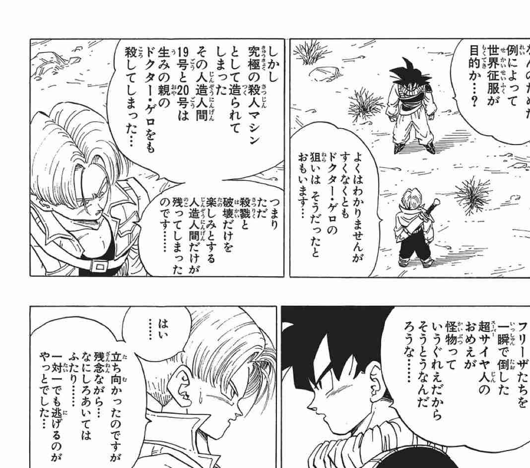 未来の人造人間はスーパーサイヤ人が1人だから厳しいけど、現代の悟空ベジータピッコロが3人かがりで1人をリンチすれば倒せそうなレベルなんよな