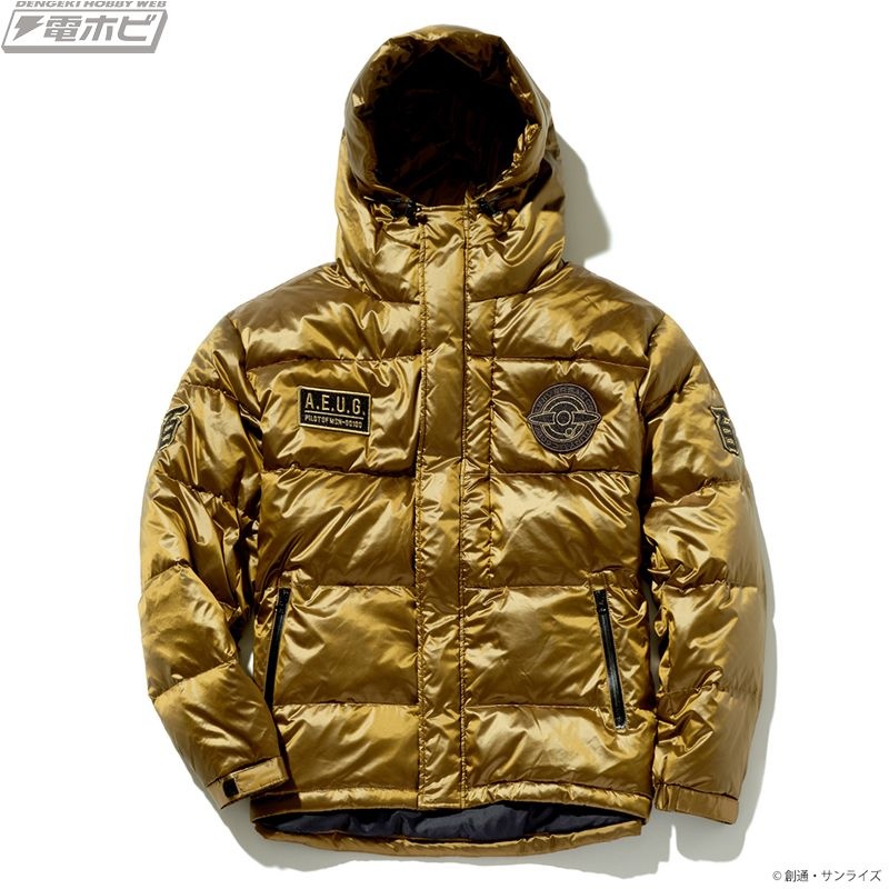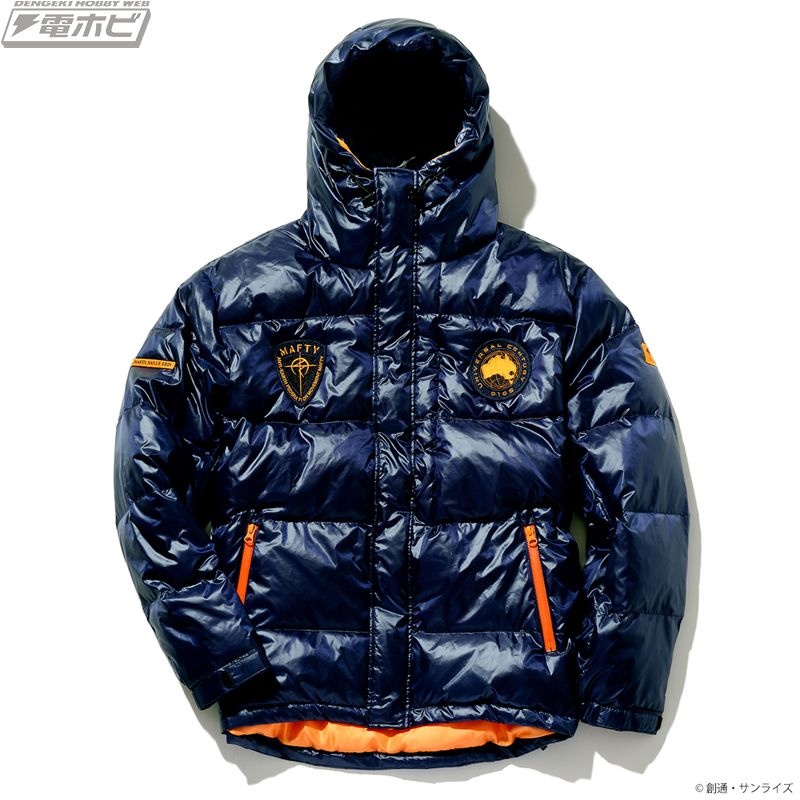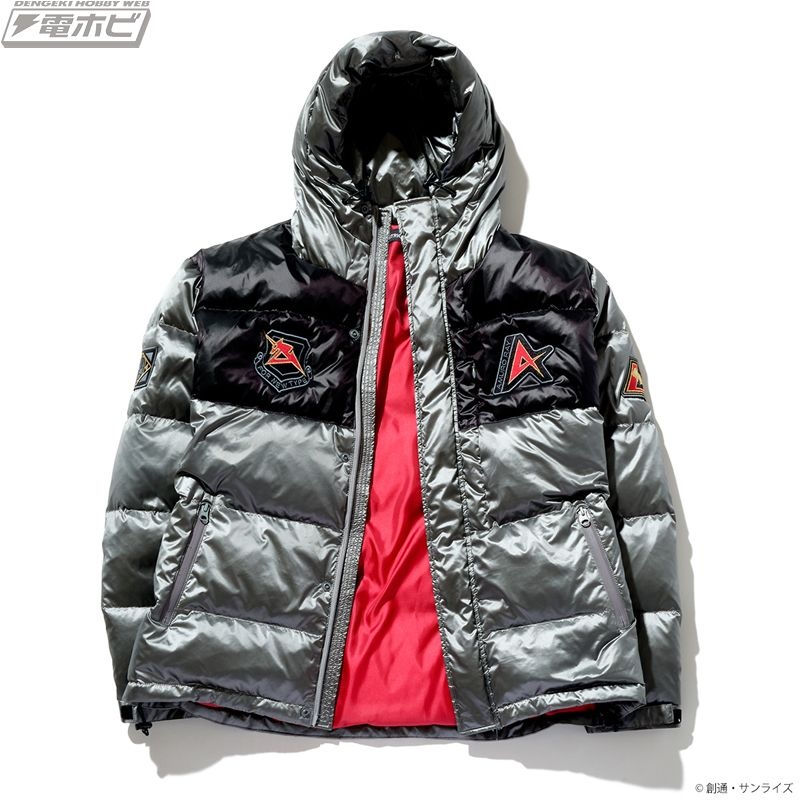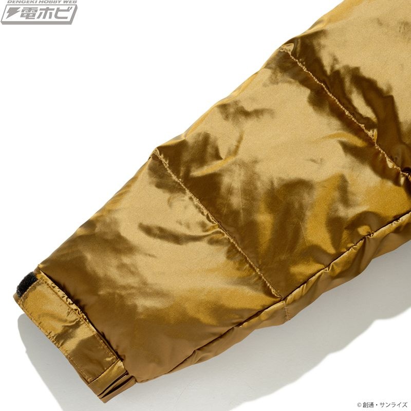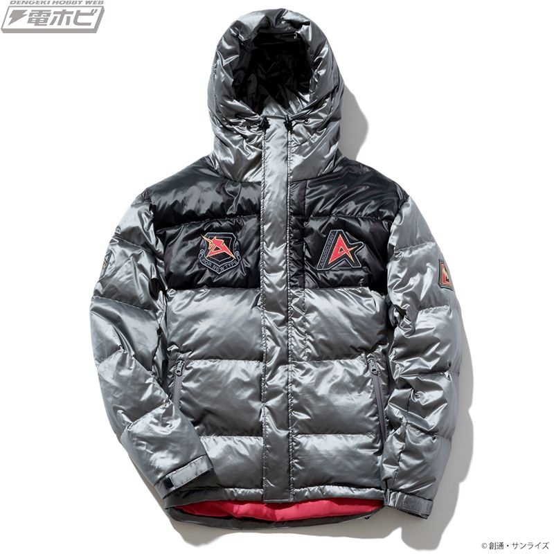 両胸、両袖の4箇所に関連モチーフのワッペンをあしらい、キャラクターの世界観を演出。表地は軽撥水加工が施された、軽くて丈夫な400Tの高密度ナイロン生地を使用。シレー加工(生地の気密性を高め、独特の光沢感を与える加工方法)を施すことにより、防風性、防寒性を高めています。