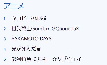 アニメでは「タコピーの原罪」が1位で、2位は「機動戦士Gundam GQuuuuuuX」。YouTubeなどで人気を博した「銀河特急 ミルキー☆サブウェイ」が5位にランクインしています。