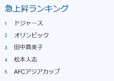 ちなみに、2024年の急上昇ランキングは以下の通り。1位が「ドジャース」、2位が「オリンピック」、3位が「田中真美子」、4位が「松本人志」、5位が「AFCアジアカップ」で、話題になった人物やスポーツ関連の語句が上位にランクインしていました。