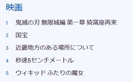 映画は興行収入が国内歴代1位の383億円に達している「鬼滅の刃 無限城編 第一章 猗窩座再来」が1位にランクイン。実写邦画として興行収入1位となった「国宝」も2位にランクインしています。