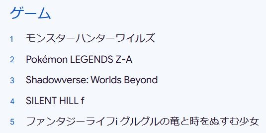 ゲームの1位は「モンスターハンターワイルズ」で、2位は「Pokemon LEGENDS Z-A」、3位は「Shadowverse: Worlds Beyond」、4位は「SILENT HILL f」、5位は「ファンタジーライフi グルグルの竜と時をぬすむ少女」でした。