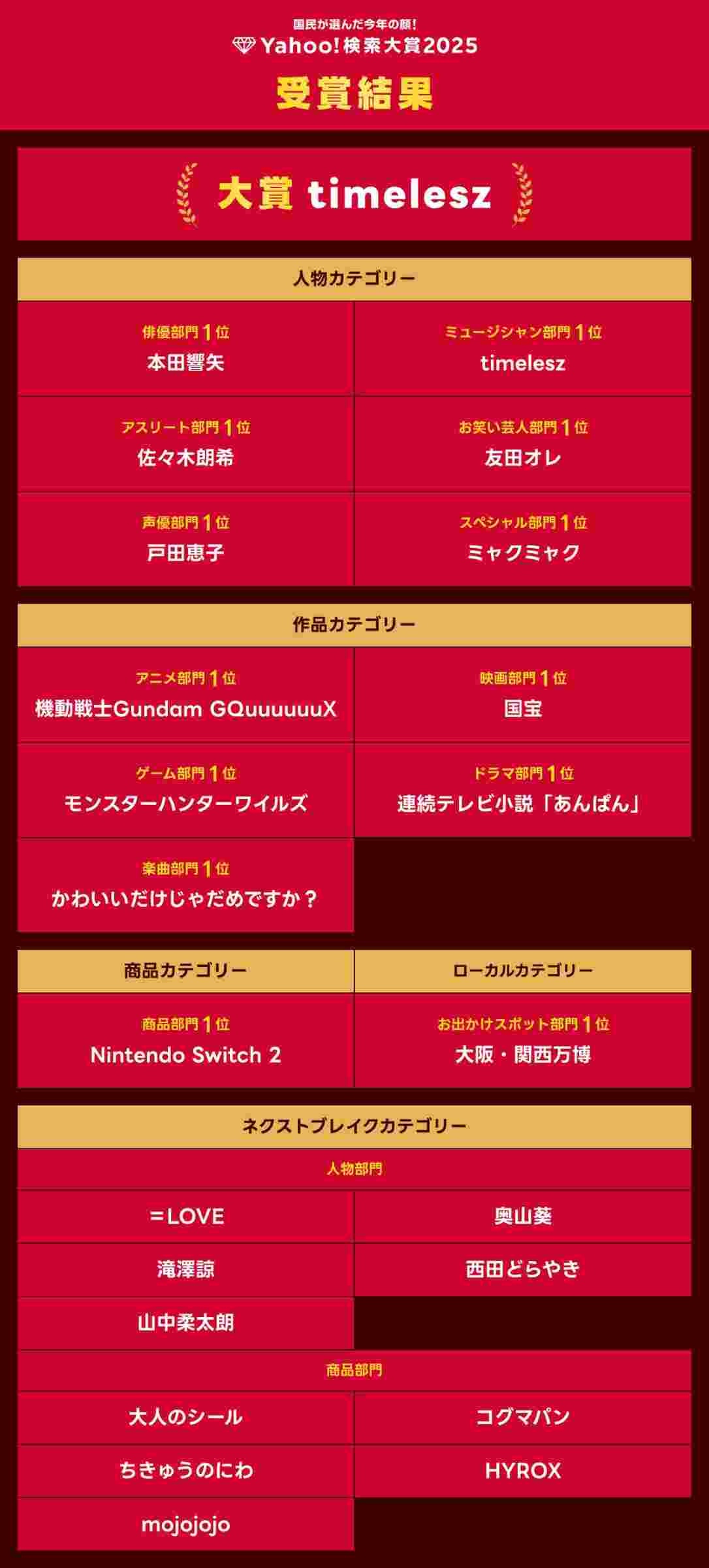 「Yahoo!検索大賞」は、前年と比べ検索数が急上昇した人物や作品といった項目をランキング形式などで発表するもの。「Yahoo!検索大賞2025」は、1月1日から11月1日までの集計データをもとに選出された。「機動戦士Gundam GQuuuuuuX」は、4月から6月までTVシリーズが放送されたアニメで、放送日を中心に検索数が上昇。「機動戦士ガンダム」シリーズのサンライズと、「エヴァンゲリオン」シリーズのスタジオカラーとの共同制作でも話題となった。1月にはTVシリーズに先がけ、一部話数を劇場上映用に再構築した「機動戦士Gundam GQuuuuuuX(ジークアクス) -Beginning-」も公開されている。