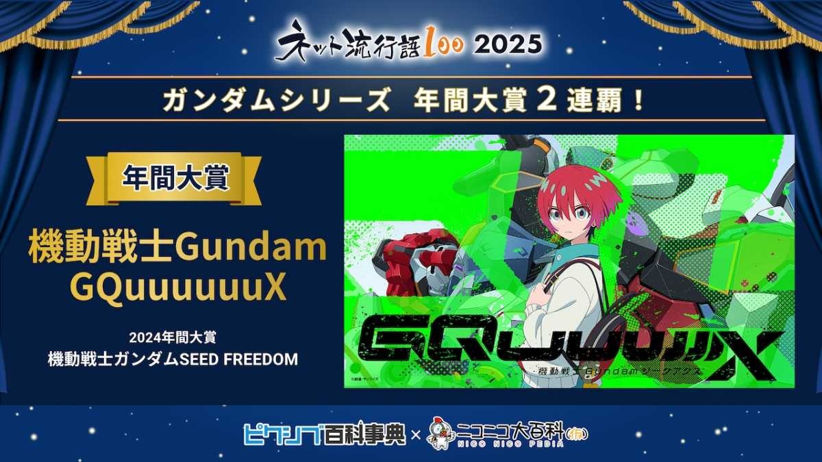 2018年にスタートし、今年で8回目の開催となる「ネット流行語100」。Webサイト・ニコニコ大百科とピクシブ百科事典における各単語ページのアクセス数の昨年比にもとづき、ネットで最も流行った100単語がノミネートされている。「ガンダム」シリーズ関連の大賞受賞は、昨年の「機動戦士ガンダムSEED FREEDOM」に続き2年連続。2位には「アマテ・ユズリハ」、4位には「シイコ・スガイ」など、20もの関連単語がランクインしており、シリーズの高い知名度と支持の広さをあらためて示す結果となった。