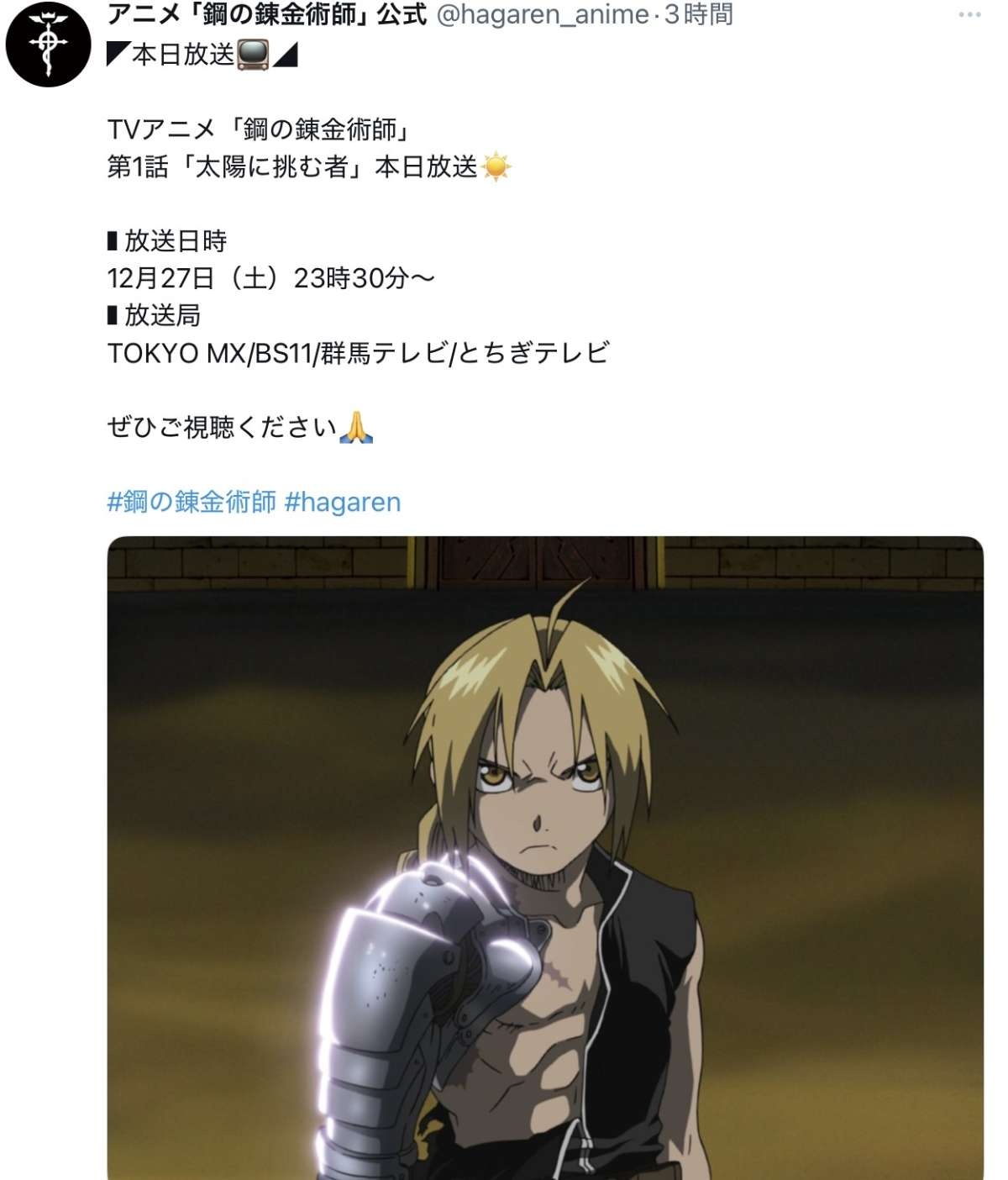 【緊急】鋼の錬金術師(2003)、今夜放送www