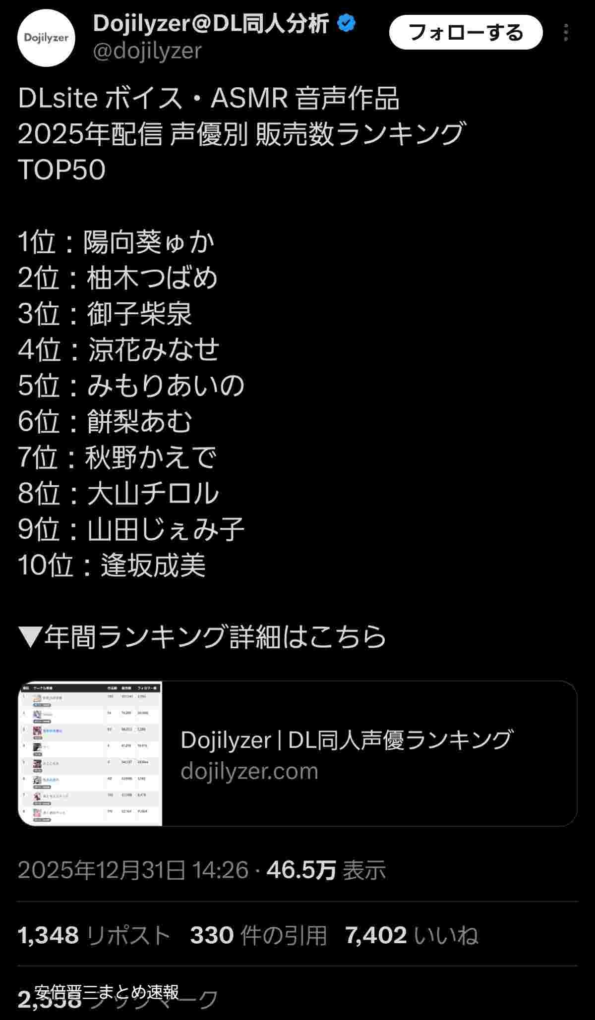 2025声優ランキング1位、陽向葵ゅか