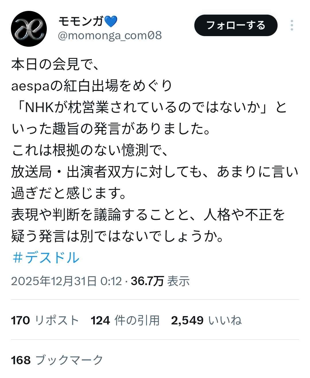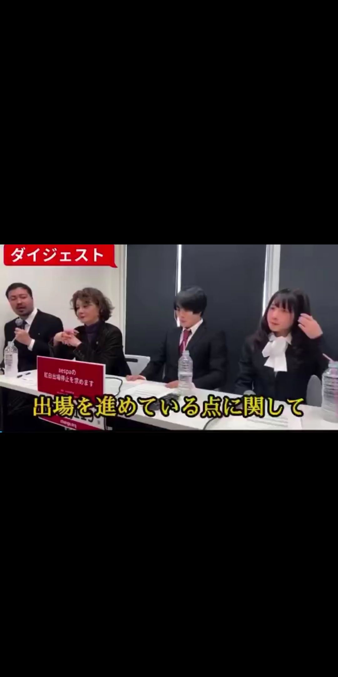 記者会見で「これだけ反対されてもNHKがaespaの出場を取り消さないのは、お金か枕営業ではないか」と発言