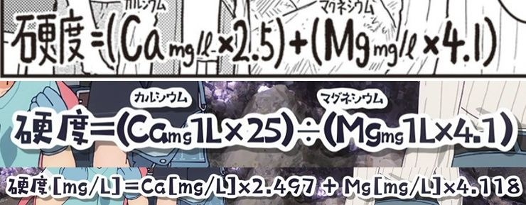 水の硬度計算式は、硬度(mg/L) = (カルシウム量(mg/L) × 2.5) + (マグネシウム量(mg/L) × 4.1) で、