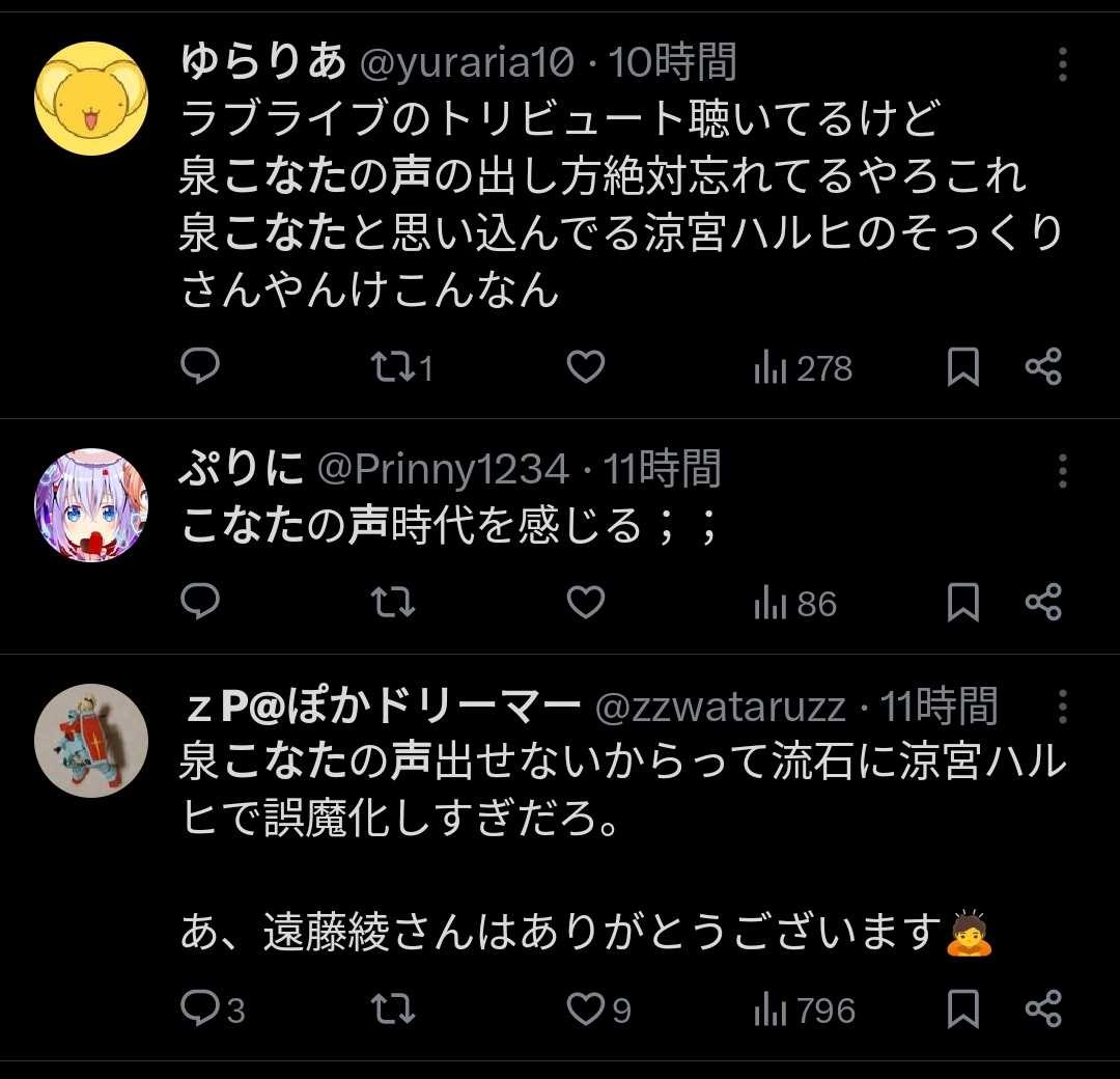 こなたの声が出せなくなったんじゃなくて、今回のトリビュートは「らき☆すたのメンバーが本人で歌う」ってディレクションされてるのでご安心を!笑一昨日の『らき☆すた』のイベントでも4人で朗読劇やってますし、去年のライブでも「宇宙鉄人キョーダイン」歌ってますので!
