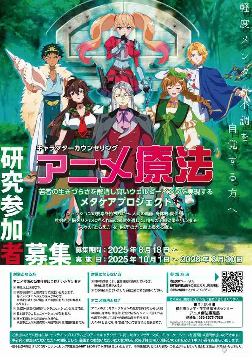 横浜市立大などの研究チームは、社会で生きづらさを抱える若者を対象に、アニメのキャラクターが悩みなどのカウンセリングをする「アニメ療法」の実証実験を始めた。