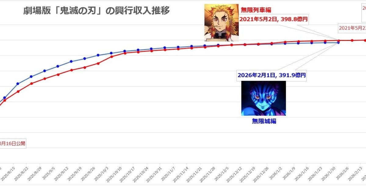 アニメ『鬼滅の刃』の劇場版『鬼滅の刃 無限城編 第一章 猗窩座再来』(2025年7月18日公開)の興収情報が発表され、公開206日間で興収393.2億円を突破した。国内歴代1位となる興収407.5億円を突破した前作『劇場版「鬼滅の刃」無限列車編』(2020年10月公開)の記録更新まで残り14.3億円となった。