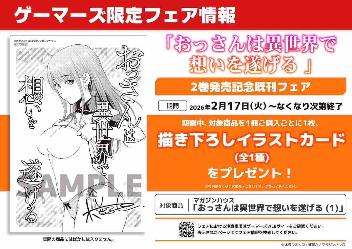 波留六氏のWeb小説を木曽フミヒロ氏がコミカライズされ、“異世界のSHURO”レーベルから各電子書店で配信されている「おっさんは異世界で想いを遂げる」2巻【AA】が、アキバでは17日に発売になった(公式発売日は19日)。