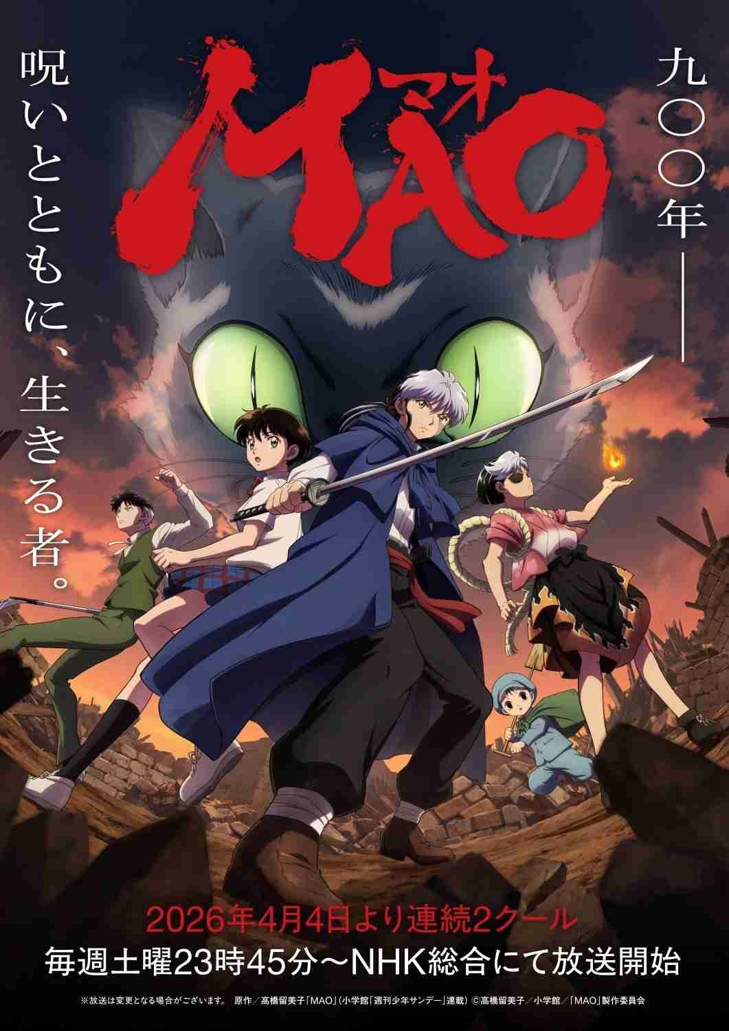 テレビアニメ『MAO』が4月4日より連続2クールにてNHK総合(毎週土曜23時45分~)で放送されることが決定した。あわせてキービジュアル、PV第1弾、エンディングテーマアーティスト情報、追加キャラクター&キャスト7人、原作者・高橋留美子による描き下ろし色紙が解禁された。