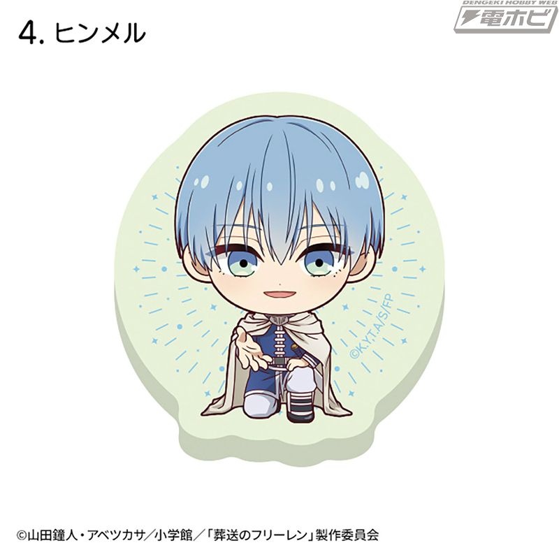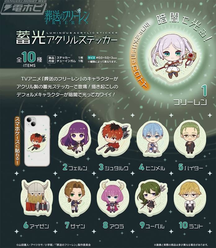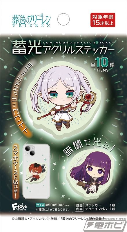 TVアニメ『葬送のフリーレン』のキャラクターが暗闇で光る蓄光アクリルステッカーになって登場! 描き起こしデフォルメイラストがカワイイ! サイズはスマホケースにも貼れる約50×50×3ミリ(※種類によって異なります)。全10種類、ブラインドボックス販売。10個入り1BOXを購入すると一度で全種類をコンプリートできます。