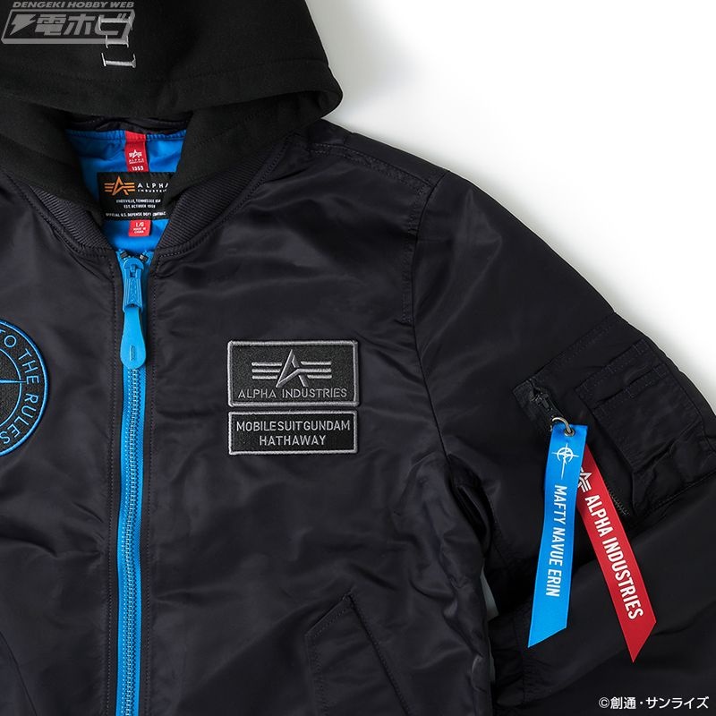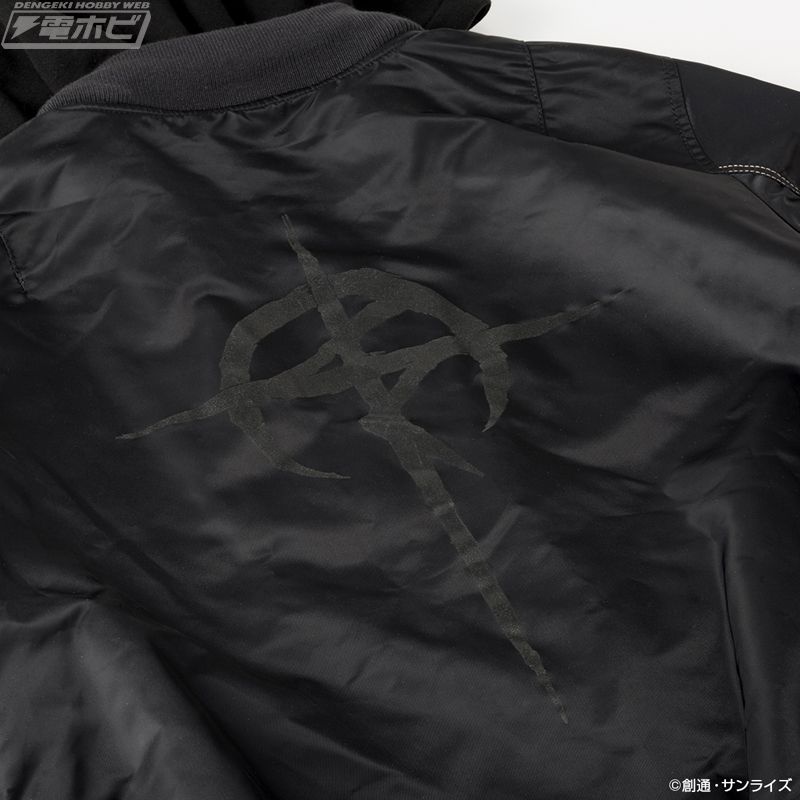 “ハサウェイ・ノア モデル”は、ブラックの本体にセルリアンブルーのジッパー、マフティーやΞ(クスィー)ガンダムの名称・型式番号のデザインもセルリアンブルーでまとめ、袖裏にはイエ口ーのステッチを施し、劇中のパイロットスーツを彷彿とさせるデザインに落とし込んでいます。背面のマフティーマークはリフレクター素材を使用した、こだわりのモデルです。