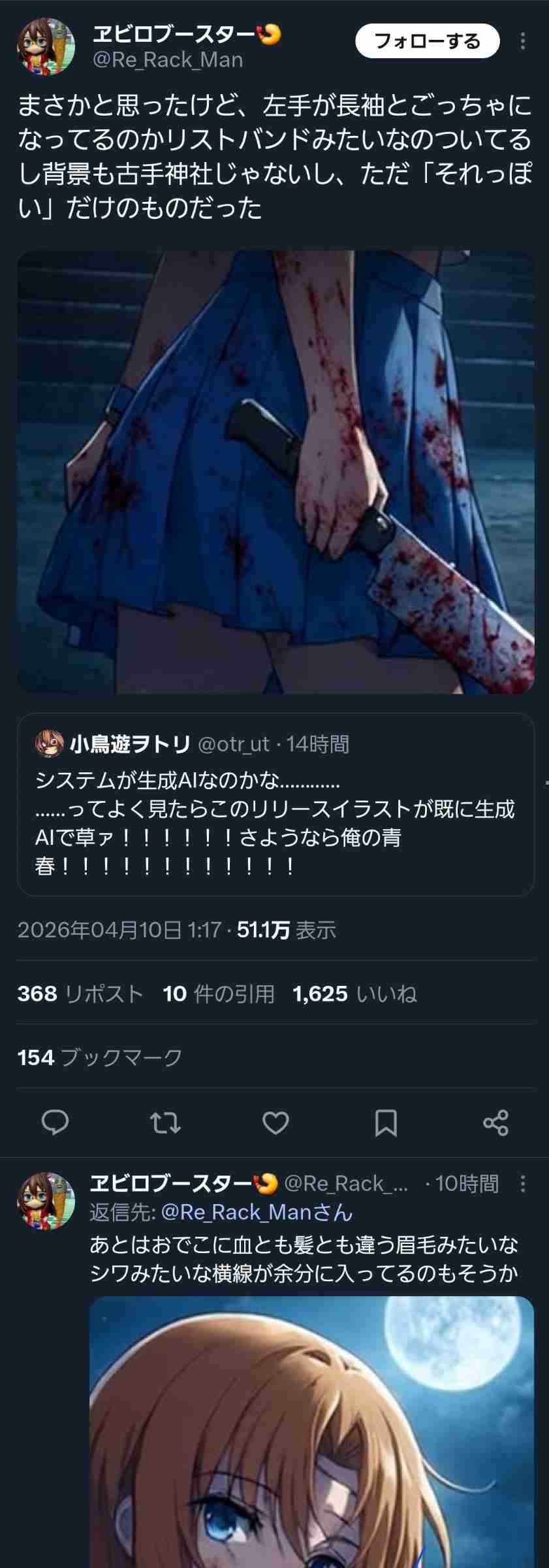 このヲトリって人は鬼太郎関係のBL二次創作やってたけどAI狩りに目覚めてそっち方向の活動やるうちに絵が描けなくなったんだよね😭