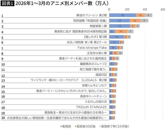 今回注目したい新作は、『勇者刑に処す 懲罰勇者9004隊刑務記録』である。Membersが配信前の6万人登録から配信終了後の27万人と、増加率350%となった、今クールにおけるピカ一のダークホースといえる。ラノベ発で久々のビックタイトルがデビュー! という感じであった。