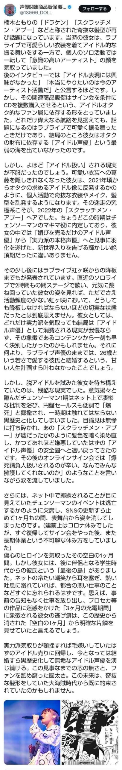 投稿は楠木ともりの活動を「実力派への選民意識と挫折」という偏向した文脈で切り捨てた悪意ある論評です。