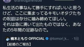 嫌儲 声優・楠木ともりさん、結婚発表後の初ツイートがこれ→オタクブチギレwww
